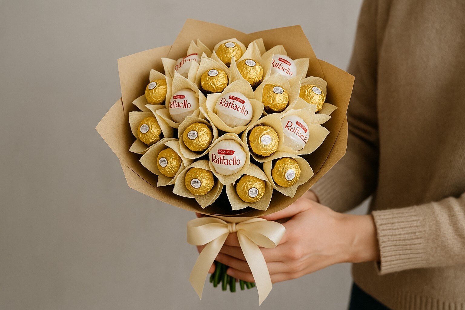 Postaw na czerwone i złote akcenty – idealnie sprawdzą się praliny Ferrero Rocher, Raffaello i czerwone lizaki w kształcie serca. Dodaj czerwoną bibułę, wstążkę w kolorze burgundu lub różu i bilecik z romantycznym wyznaniem. Taki bukiet z powodzeniem zastąpi klasyczne róże.
