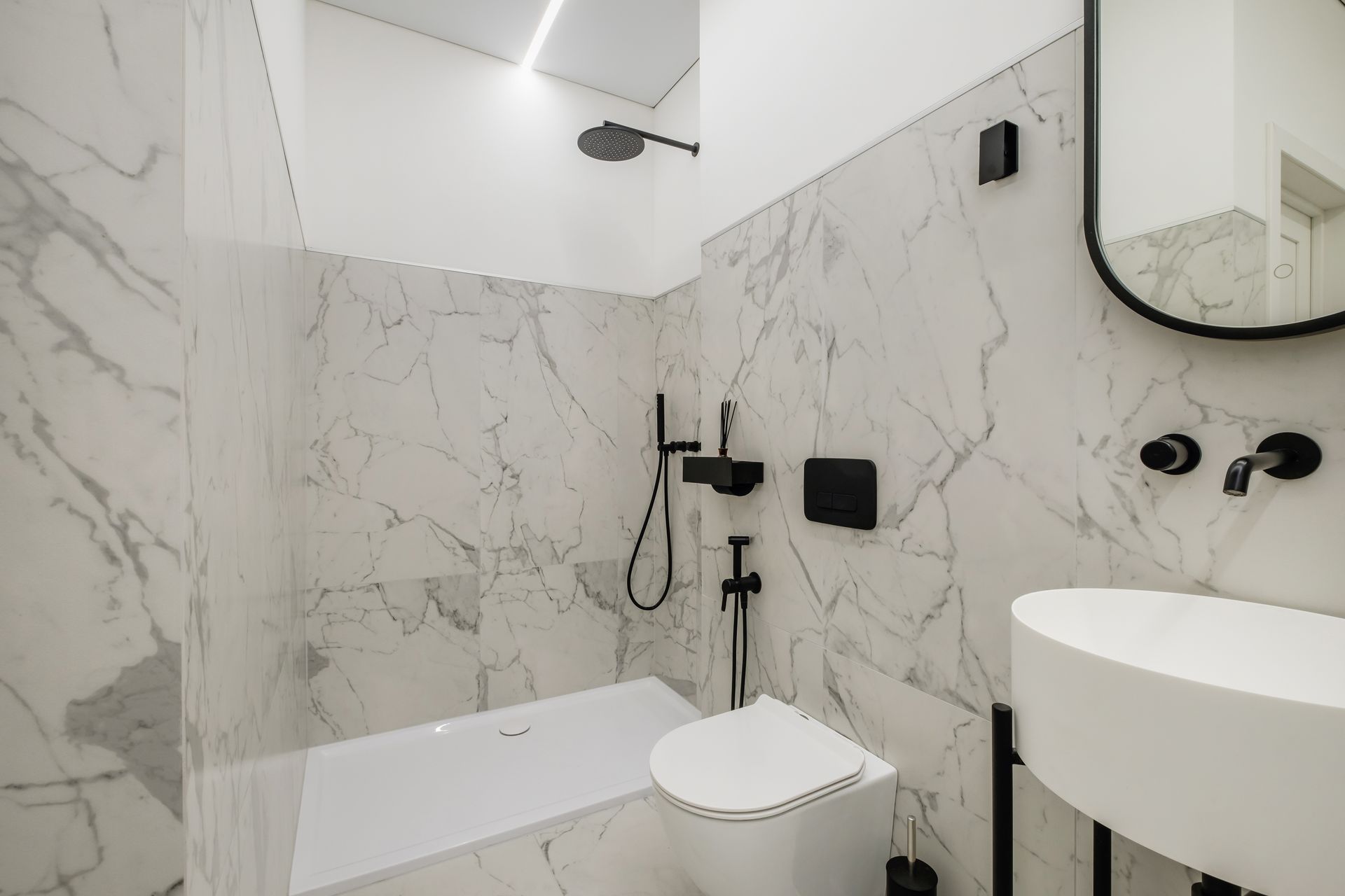 Zestaw nowoczesną, białą toaletę myjącą z ciemnymi płytkami – antracytowym gresem, czarnym marmurem czy granitem. Takie kontrasty dodadzą łazience wyrazistości i elegancji, a subtelne detale będą wyróżniać się na tle ciemnego otoczenia.